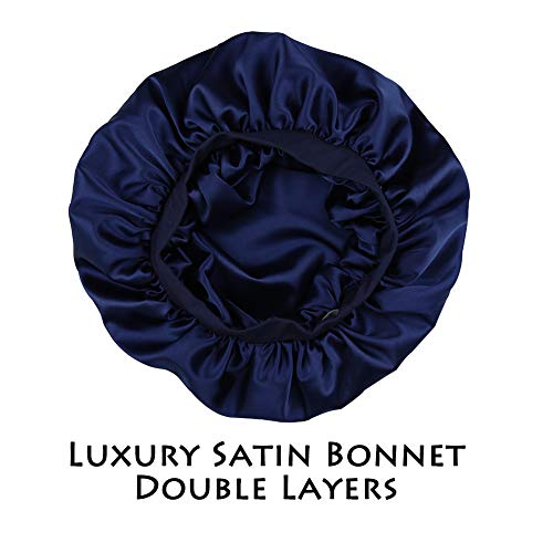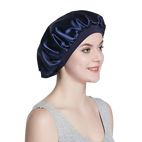 Satén sedoso de doble capa. Reversible y versátil Este gorro de noche reduce la fricción a diferencia del gorro satinado de una sola capa anterior que tiene forro rugoso sin forro satinado. Dos opciones para ti. Puedes usar satén estampado de moda en el interior o satén teñido simple en el interior. Ambas capas son de satén sedoso. Este producto se puede usar no solo durante el sueño, pero también para maquillarse, bañarse o incluso hacer las tareas del hogar.