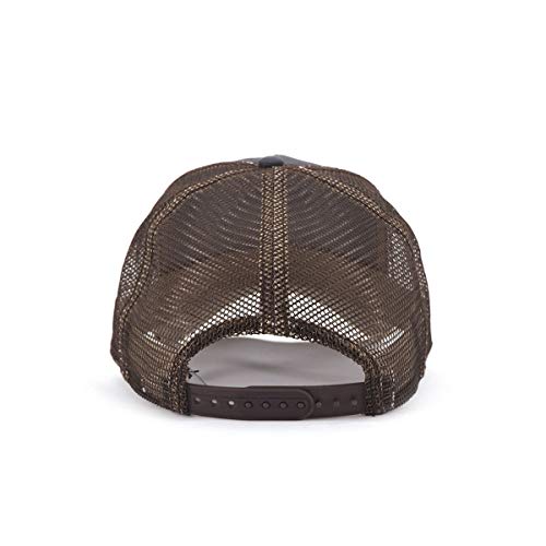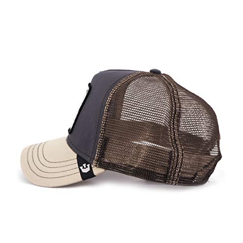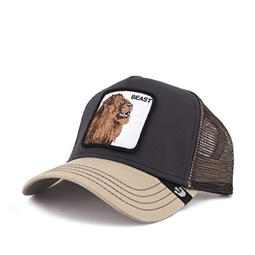 Gorra de béisbol Lion Beast marrón y gris de Goorin bros. El sombrero presenta una visera curva, panel frontal de algodón con parche grande con diseño bordado y escritura y red en los lados.