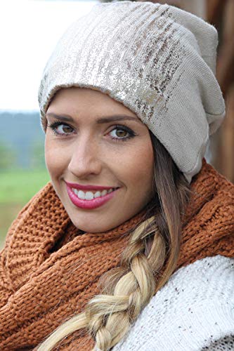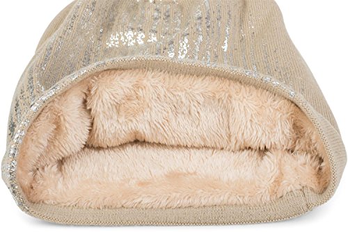 styleBREAKER cálido Gorro Beanie de Punto Fino con Estampado metálico y Relleno Interior Polar Slouch Beanie Largo Unisex 04024132 Beige / Plata