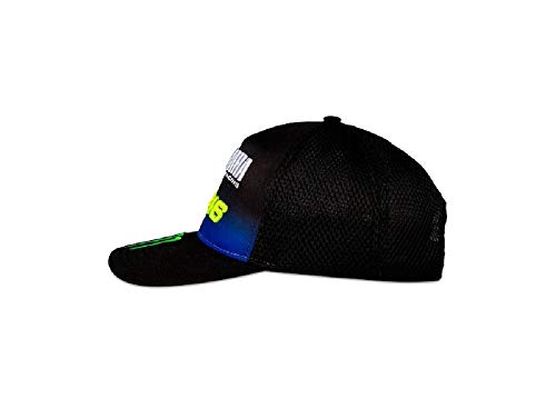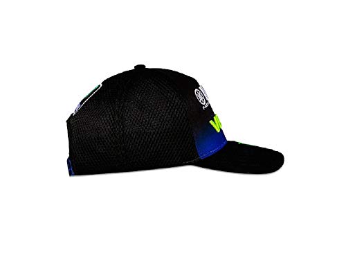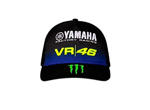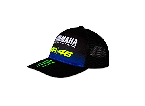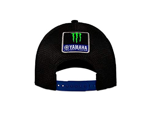 Gorra trucker con visera Mid Visor perteneciente a la colección Yamaha Black inspirada en la MotoGP M1 en versión 2019. En la parte frontal hay la gráfica VR46 de Valentino Rossi y el Diapason Yamaha Racing. en la visera, la garra de Monster Energy y en la parte posterior de Monster y Yamaha. Talla única ajustable. Composición: 100 % poliéster.