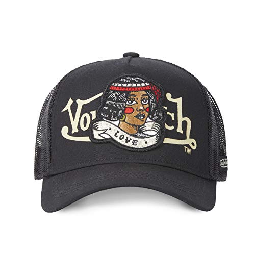 Elige una gorra de malla Von Dutch negra con diseño de cara de mujer estilo tatuaje personalizado, modelo Love Black, gorra trucker hombre y mujer bordado original y logotipo de Von Dutch flocado, visera curvada negra, malla negra, talla única ajustable.