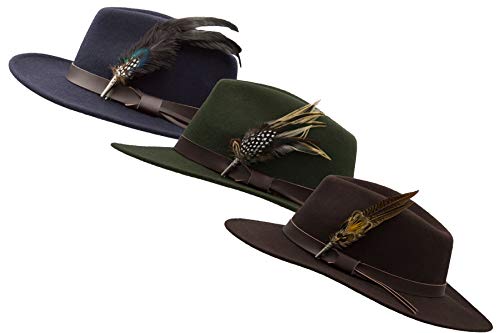 Añade el toque final a tu look con este elegante fedora Richmond unisex, con broche de pluma. Este sombrero de fieltro de 100 % lana está rematado con una cinta de cuero auténtico y un broche de estilo campestre de quita y pon. El broche de nuestro sombrero en verde oliva oscuro está compuesto por plumas de gallina, de pintada y de faisán. El broche de nuestro sombrero en marrón está compuesto por plumas de faisán dorado y de faisán común. El broche de nuestro sombrero en azul marino está compuesto por plumas de gallo de tono bronce, plumas de avestruz y las inconfundibles plumas azules de pavo real y las de pintada. Disponible en tres colores. El tejido es resistente a la lluvia; el ala tiene un ancho de aprox. 7,5 cm, y la corona un alto de aprox. 10 cm. Además, este fieltro se puede plegar, lo cual hace que sea increíblemente duradero. Producto creado conforme a los estándares más exigentes y por un fabricante inglés especializado en ropa de la mejor calidad para escapadas rurales e hípica. Por favor, consulta nuestra guía de tallas para encontrar el sombrero adecuado para ti.