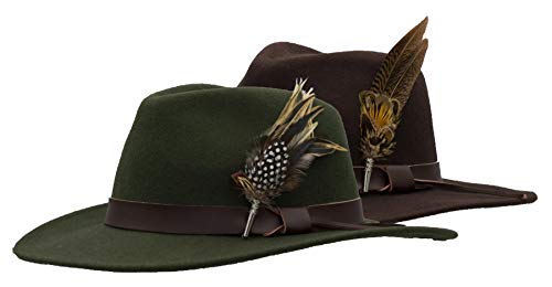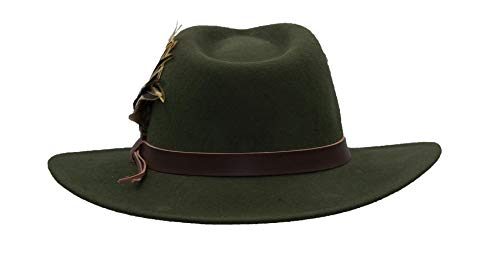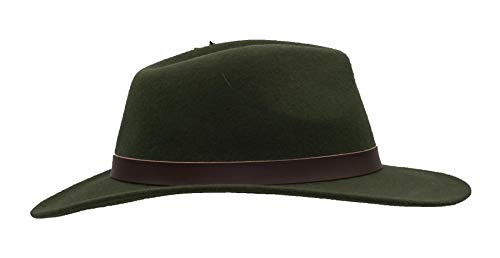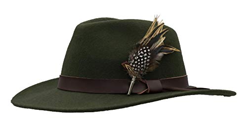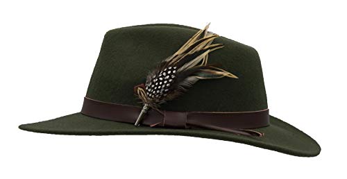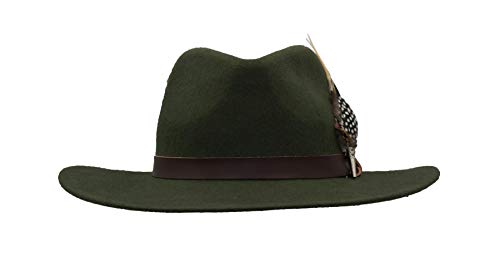 Walker and Hawkes Richmond Fedora Unisex de Fieltro con Cinta de Cuero y Broche con Plumas Plegable Verde oliva